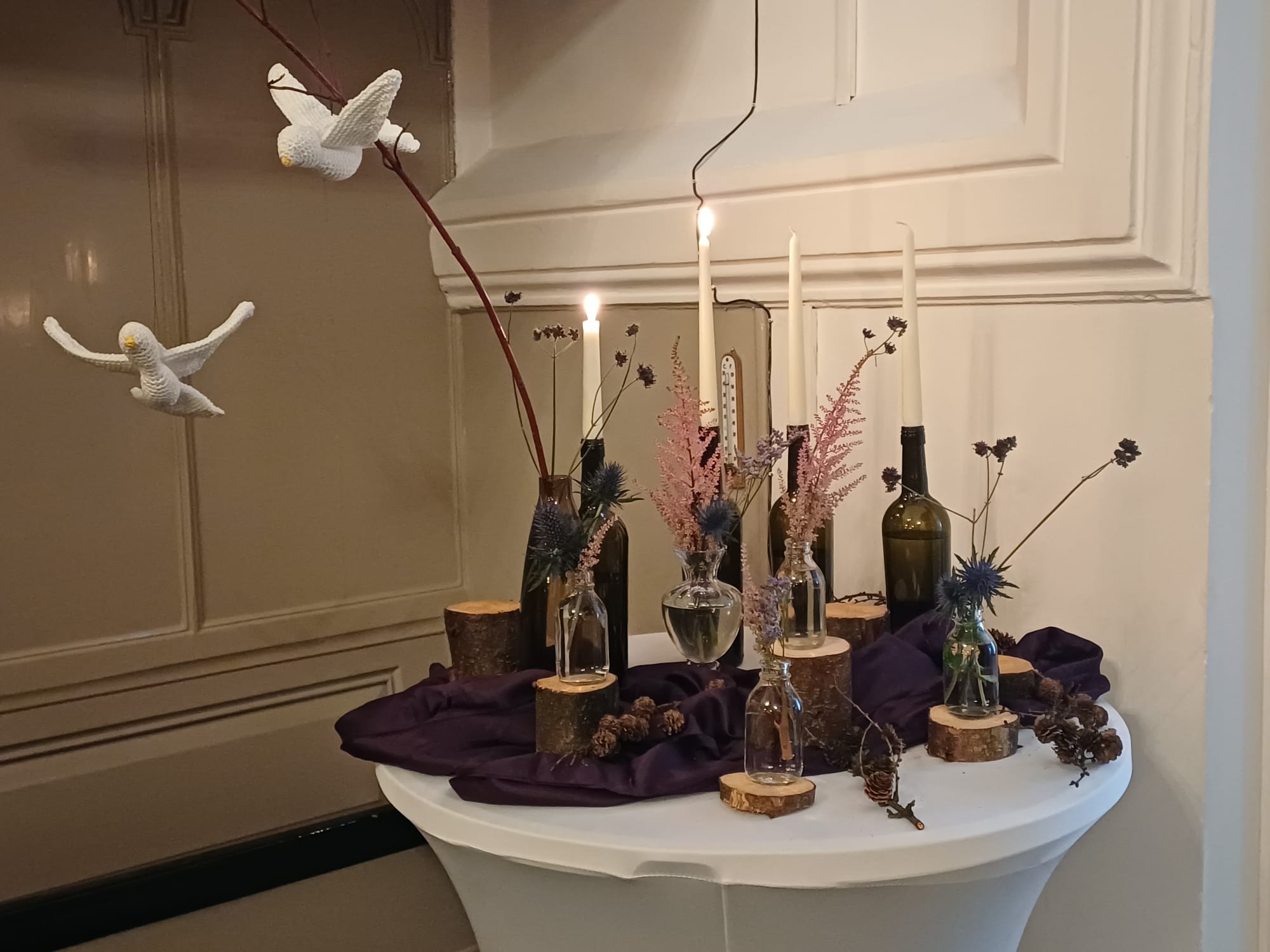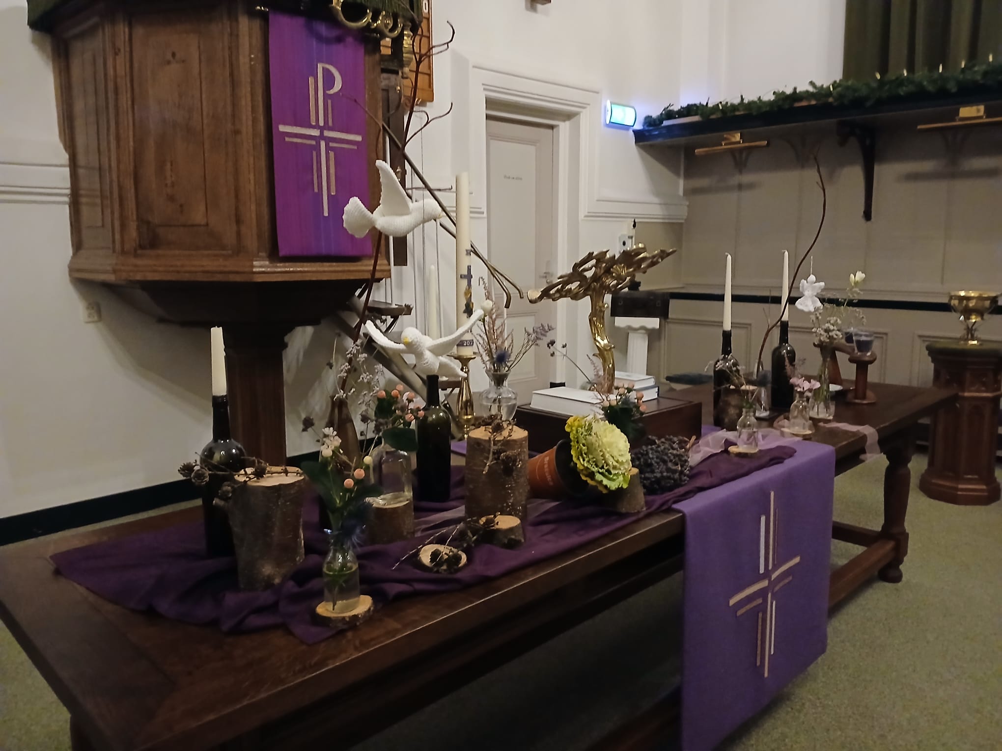 Het donker is doorbroken, het paars verzacht, een feestelijke kleur wit gloeit op. Drie kaarsen branden. Naast de duiven is er nu ook een engel in de schikking.