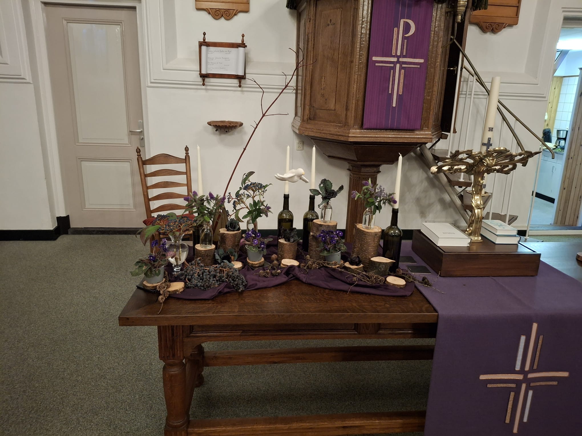 We verwachten het licht, dat is het uitgangspunt van de schikkingen in de adventtijd. We beginnen in het donker, dat ziet u aan de donker paarse materialen. Paars is de kleur die ons tot inkeer roept. Het donkere wil ons niet verlammen, het vraagt om het mooie te zien in wat donker is en hoop op licht te blijven houden. Er brand 1 kaars,een lichtpuntje. De duif staat voor Gods geest.