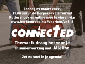 Deze zondag is er weer een Connecteddienst! Nu in de hervormde kerk van Puttershoek. Deze gezamenlijke dienst van onze 3 PKN-gemeentes begint om 11.00 uur. Dat komt u misschien extra goed uit, want in de voorafgaande nacht gaat de klok een uur vooruit! Thema van de dienst is: ‘Ik draag het voor je!’. De consulent van de hervormde gemeente Puttershoek, ds. Johan Breure, gaat voor en band All4One werkt mee aan de dienst. Voor de kinderen is er na de Bijbellezing kindernevendienst. We hopen dat velen van jullie en u die dienst zullen meevieren! | ||